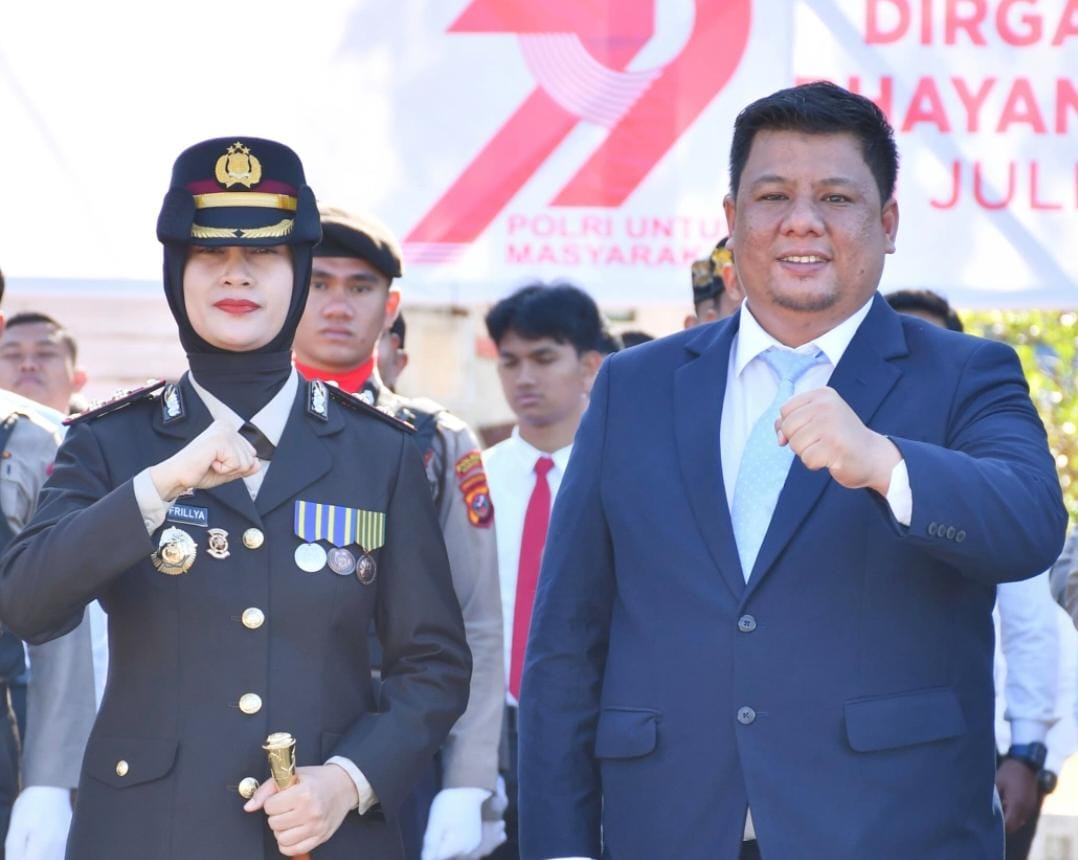 CORAKNEWS.COM, SAMOSIR – Bupati Samosir Vandiko Timotius Gultom, ST bersama unsur Forkopimda Ketua DPRD Samosir Nasip Simbolon, Kajari Samosir Karya Graham Hutagaol, SH, M.Hum, Pabung Kodim 0210/TU Mayor G. Sebayang mengikuti Upacara HUT Bhayangkara ke-79 yang digelar di Tanah Lapang Pangururan, Selasa (1/7/2025). Bertindak sebagai Inspektur Upacara Kapolres Samosir AKBP Rina Frillya, S.I.K.