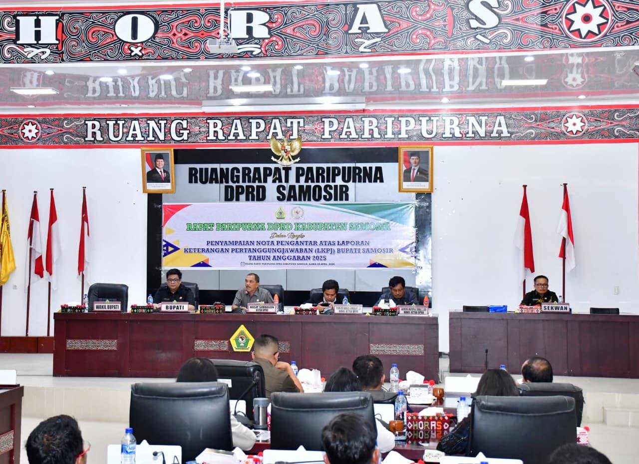 CORAKNEWS.COM, SAMOSIR – Bupati Samosir menyampaikan Nota Pengantar Laporan Keterangan Pertanggungjawaban (LKPJ) Tahun Anggaran 2025 dalam rapat paripurna DPRD Kabupaten Samosir yang digelar di Gedung DPRD, 09/04/2026. Penyampaian LKPJ tersebut merupakan kewajiban kepala daerah sebagai bentuk akuntabilitas penyelenggaraan pemerintahan selama satu tahun anggaran.