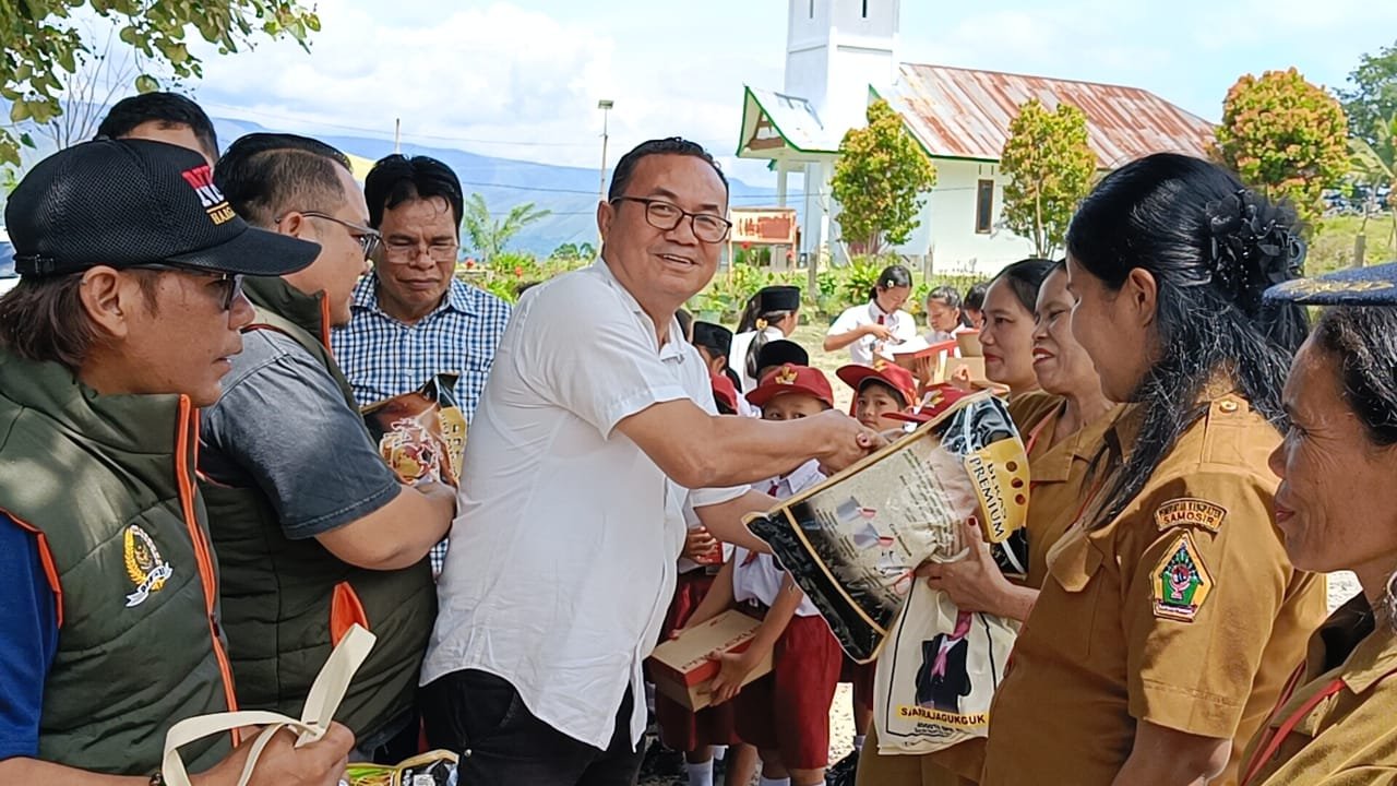 Melalui staf ahli dan tim relawan, Sabam menyalurkan 117 pasang sepatu plus kaos kaki untuk siswa, serta paket sembako bagi para guru. Penyerahan dilakukan bersama Anggota DPRD Samosir Fraksi Gerindra Renaldi Naibaho dan Basaruddin Situmorang, didampingi Kabid SD Disdikpora Samosir Jauraja Sabinus Sidauruk, S.Pd dan Kasi Kelembagaan Sarpras SD Faber Nadeak.