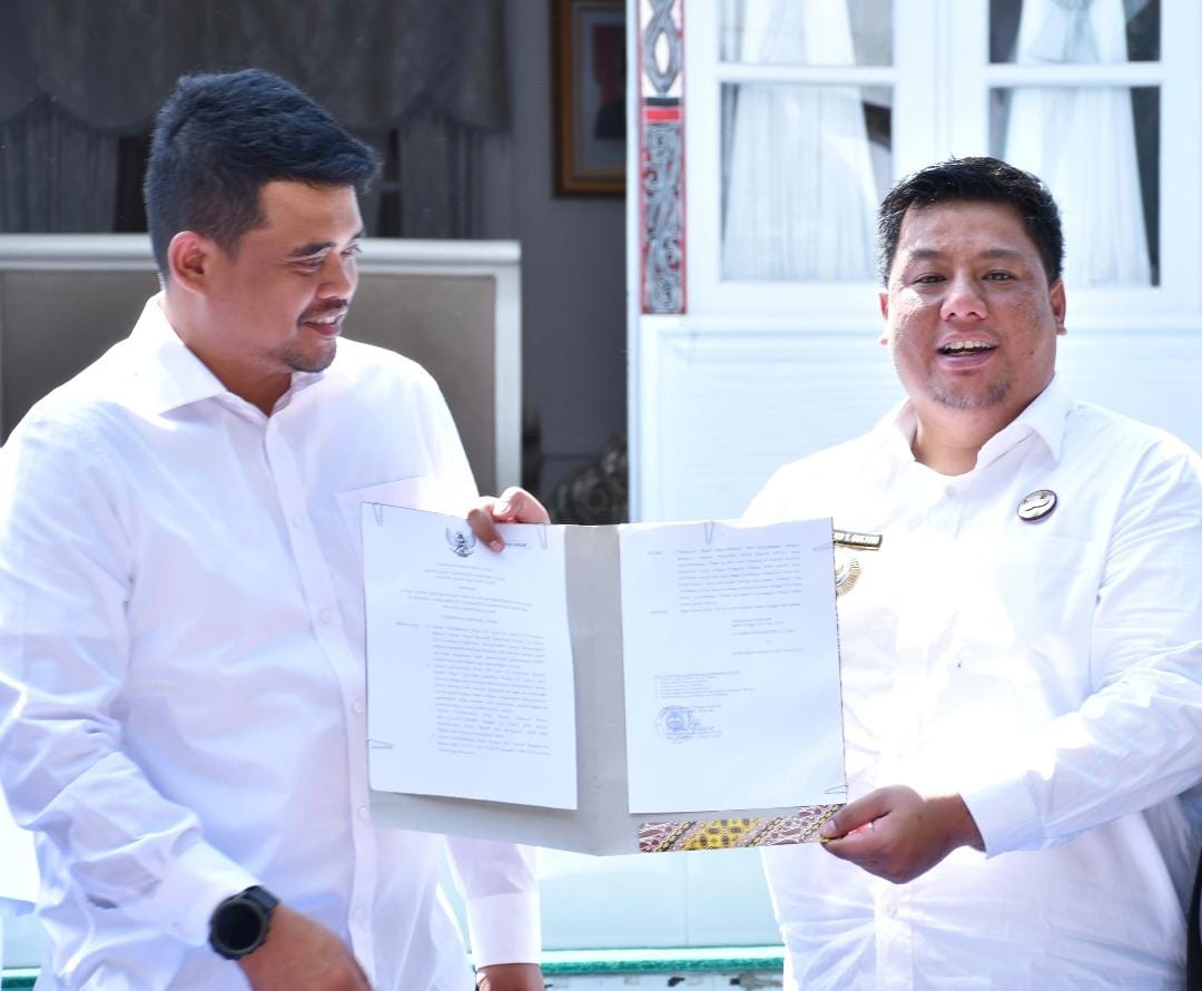 Penyerahan ditandai dengan penanda-tanganan berita acara serah terima penyerahan aset tanah dan bangunan Rumah Dinas Bupati Samosir, oleh Gubernur Bobby Nasution dan Bupati Vandiko Gultom.