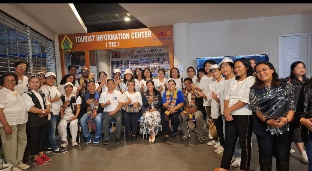 CORAKNEWS.COM, SAMOSIR -Pejuang wastra (kain tradisional) Kyan Ulos Fony Sitanggang Pematang Siantar mitra keluarga besar Punguan Parompuan HKBP Distrik V Sumatera Timur berikan bantuan seragam rompi motif ulos kepada petugas parkir di Kota wisata Pangururan yang berlangsung di Water Front City Pangururan, Sabtu (21/9/2025).