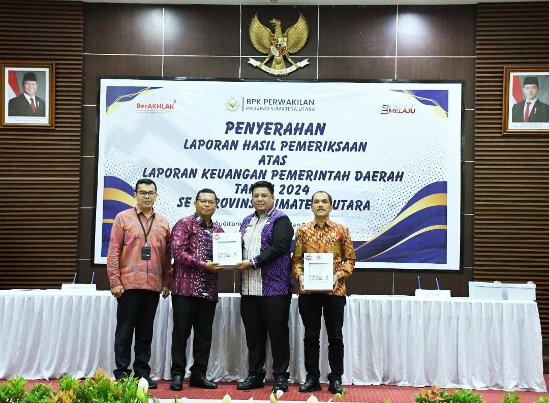 CORAKNEWS.COM, SAMOSIR – Pemerintah Kabupaten Samosir kembali mengukir prestasi membanggakan dengan meraih opini Wajar Tanpa Pengecualian (WTP) atas Laporan Keuangan Pemerintah Daerah (LKPD) Tahun Anggaran 2024. Raihan ini sekaligus menjadi WTP yang ke-8 yang diterima langsung oleh Bupati Samosir Vandiko T Gultom bersama Ketua DPRD Samosir Nasip Simbolon dari Kepala Badan Pemeriksa Keuangan (BPK) Republik Indonesia perwakilan Sumatera Utara, Paula Henry Simatupang, S.E., M.Si., Ak., CA, CFrA, CFA (Aust), CSFA, ACPA, GRCP, GRCA, ERMAP di Aula Auditorium Medan, dalam rangkaian agenda penyerahan LHP untuk seluruh pemerintah daerah se-Sumatera Utara, Jumat (23/5/2025).
