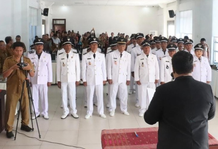 CORAKNEWS.COM, SAMOSIR – Bupati Samosir Vandiko Gultom mengukuhkan 25 kepala desa untuk perpanjangan masa jabatan 2 tahun, sesuai Undang-Undang Nomor 3 Tahun 2024 dan Surat Edaran Menteri Dalam Negeri Republik Indonesia Nomor: 100.3/4179/SJ tanggal 31 Juli 2025, yang berlangsung di Aula Kantor Bupati Rianiate, Selasa (19/8/2025).