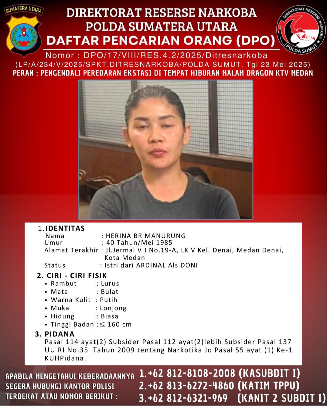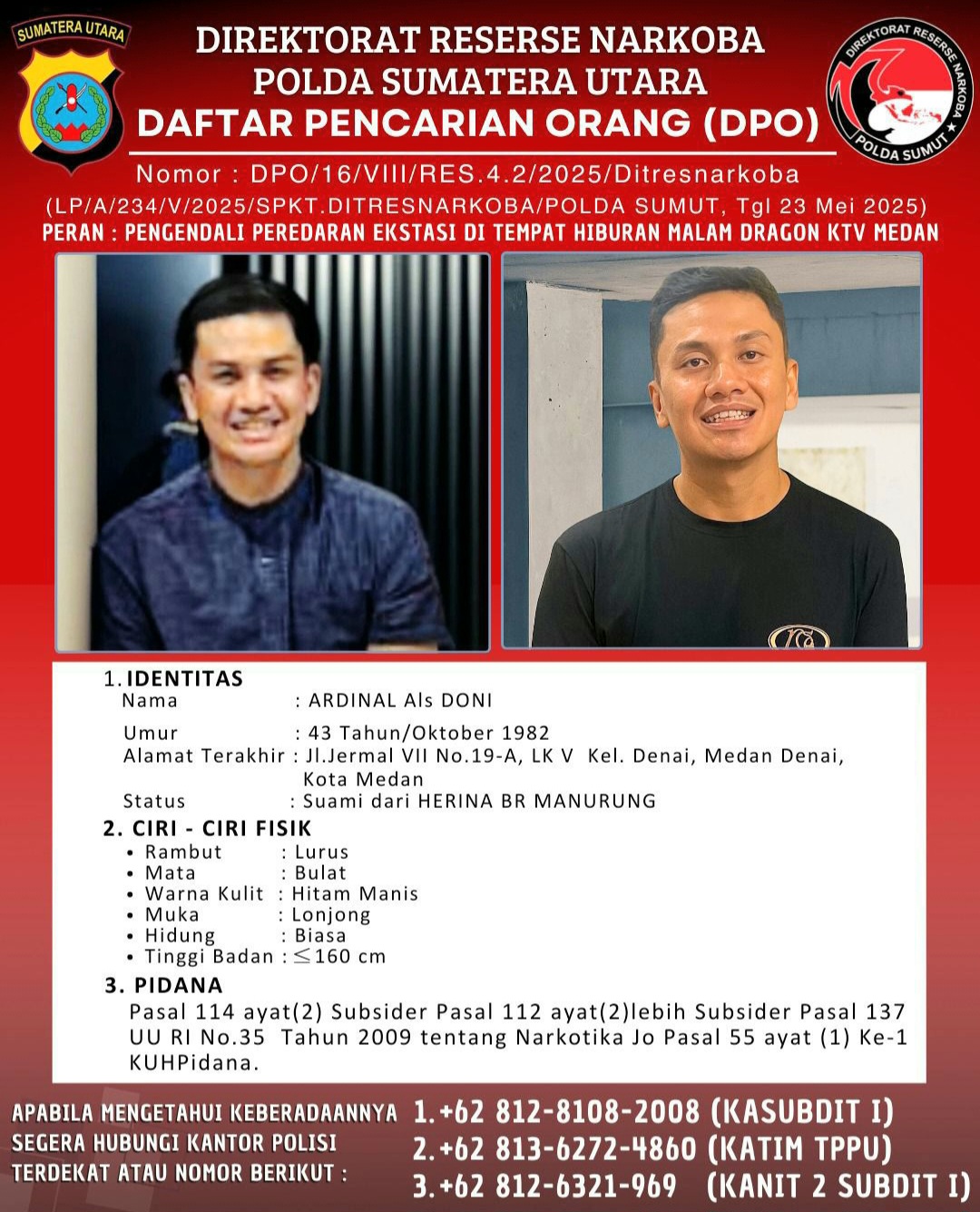 “Berdasarkan hasil penyelidikan dan keterangan para tersangka yang sudah diamankan, kami menetapkan Ardinal alias Doni dan Herina br Manurung sebagai DPO. Keduanya berperan sebagai pengendali peredaran ekstasi di Dragon KTV,” tegas Dirresnarkoba Polda Sumut, Kombes Pol Jean Calvijn Simanjuntak, Selasa (2/9/2025).