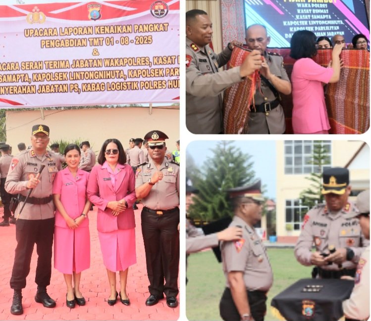 CORAKNEWS.COM, HUMBAHAS – Polres Humbang Hasundutan melaksanakan upacara kenaikan pangkat pengabdian dan serah terima jabatan sejumlah pejabat utama, bertempat di Lapangan Apel Polres Humbang Hasundutan, Tapian Nauli, Kecamatan Lintong Nihuta, Senin (4/08/2025).