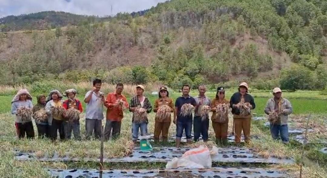 CORAKNEWS. COM, SAMOSIR – Tumiur Gultom, Kadis Ketapang dan Pertanian Kabupaten Samosir, melakukan panen bawang merah bersama di lahan Bapak Pardiman Limbong, anggota Kelompok Tani Pinasada, di Desa Aek Sipitudai, Kecamatan Sianjur Mulamula, pada 15 September 2025.