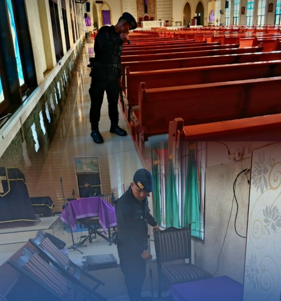 Setibanya di lokasi, personel terlebih dahulu berkoordinasi dengan pihak pengamanan wilayah sebelum melaksanakan sterilisasi secara menyeluruh. Pemeriksaan dilakukan pada berbagai area, mulai dari mimbar, ruang ibadah, kursi, sound system, hingga fasilitas pendukung seperti toilet, pot bunga, tempat sampah, serta area sekitar gereja.